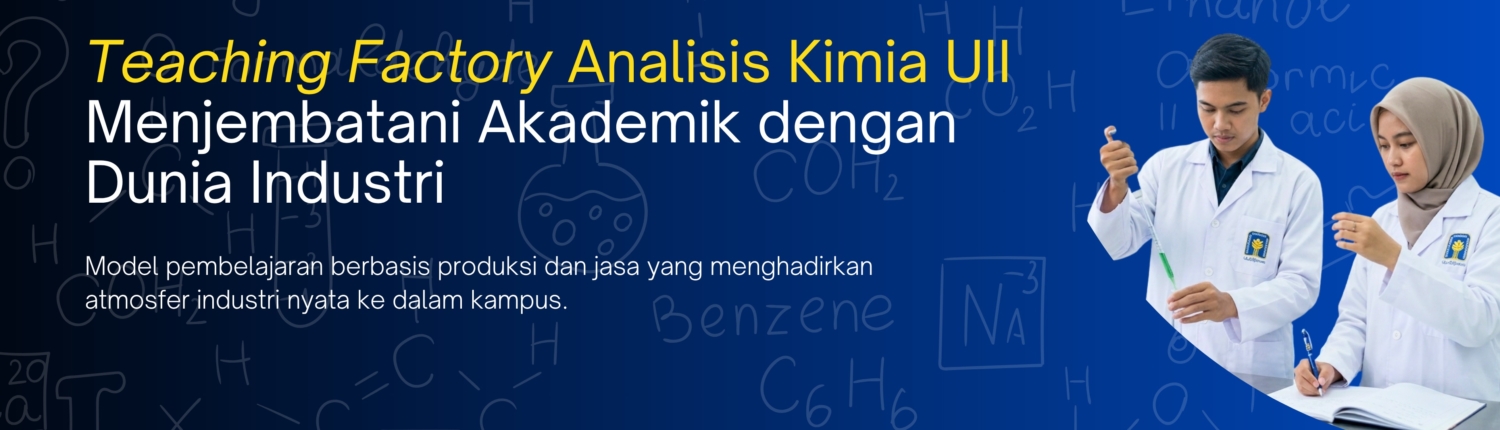 Teaching Factory di Program Studi Analisis Kimia UII bertujuan untuk mengintegrasikan proses pembelajaran dengan kegiatan kerja nyata berbasis industri di bidang analisis kimia, sehingga mahasiswa memperoleh pengalaman otentik (authentic learning) yang selaras dengan kebutuhan dunia usaha dan dunia industri (DUDI), serta mampu menghasilkan lulusan yang kompeten, profesional, berdaya saing, dan siap kerja.